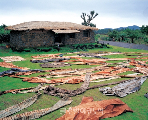 감물에 천착한 이유는 단하나. 절대로 빠지지 않는다는 것이다. 그리고 어떤 종류의 직물이라도 그 물성을 더 강하게 하므로 수 십 차례나 물들일 천들에게 보약이 되기 때문이다.
