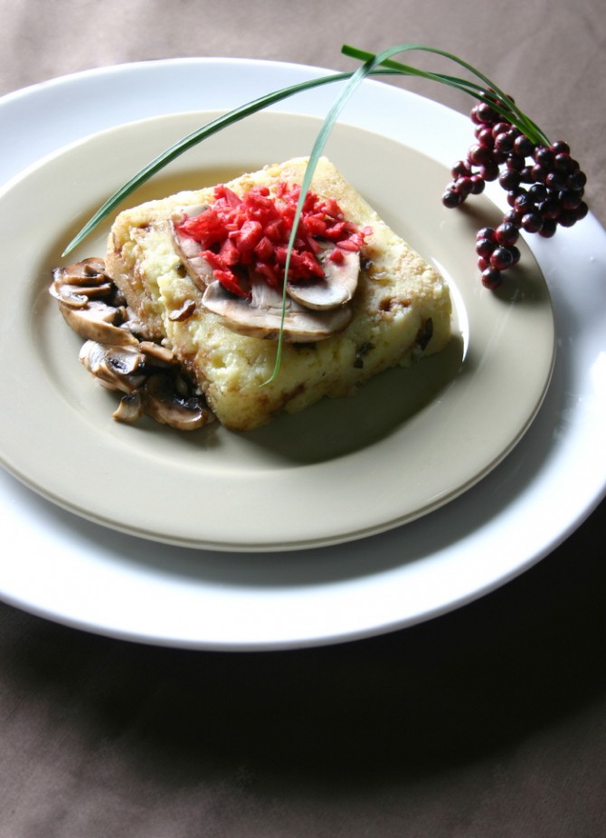 5. 3번을 접시에 담고 소금에 절인 비트를 다져서 올린 후 양송이버섯을 곁들인다.
