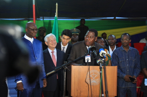 이미지 확대보기국제청소년연합(IYF)이 아프리카 베냉 깔라비 시에서 조성하는 대규모 산업, 교육, 레저 복합단지 기공식에서 야이보니 대통령이 축사를 하고 있다.