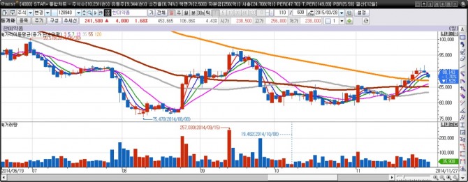 한미약품은 2013년 5월 6일 161000원을 고점으로 하락추세로 접어든다. 2013년 6월 25일엔 120일선이 종가상으로 처음 깨진다. 이후 2014년 11월 21일 120일선을 돌파하기까지 1년 이상을 하락하며 반토막이 난다. 물론 중간 중간 짧은 반등이 있었다.(독자 여러분들께서 직접 HTS로 확인해 보시기 바랍니다.)