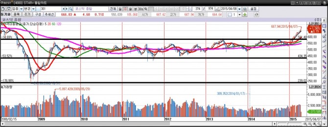 지난 7일 코스닥은 4.68포인트(0.71%) 오른 666.83으로 거래를 마치며 지난 2008년 1월 15일(673.25) 이후 7년 3개월여 만에 최고치라며 많은 언론들이 호들갑을 떨었습니다.