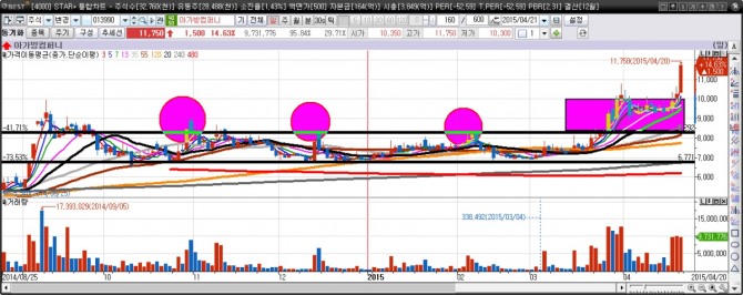 오늘 예시된 아가방 차트도 전고점 돌파종목으로 볼 수 있습니다. 6600원대 하단과 8000원대 초반에서 움직이던 주가는 3월 26일 대량거래량을 동반하며 큰 폭으로 상승하며 박스권을 돌파합니다. 그리고 시간조정을 거치고 한 번 더 큰 폭으로 상승합니다.