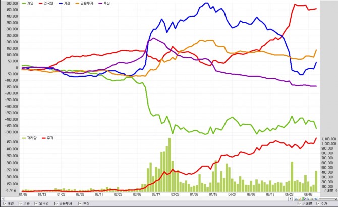 한미약품이 급등하기 시작한 것은 480일 이동평균선을 돌파하는 3월 초순부터입니다. 매매추이 차트에서 볼 수 있듯이 한미약품의 1차 상승을 이끈 주포세력은 기관이었습니다. 기관 중에서도 금융투자가 선도적인 역할을 했습니다.