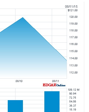 이는 하루 전의 마감시세인 119.72달러에 비해 하루사이 5.2% 떨어진 것이다.