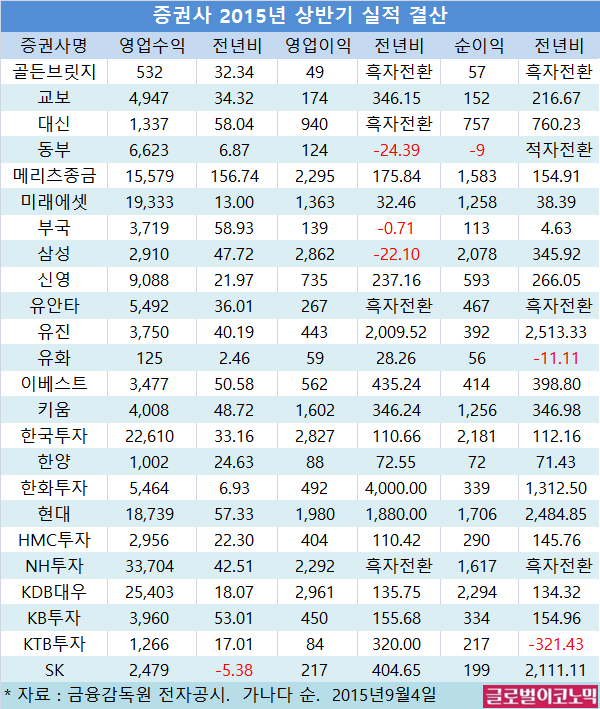 글로벌이코노믹이 4일 유력 상장 증권사와 비상장 증권사 24개사의 올 상반기 실적을 전수 조사한 결과 매출액, 영업이익, 당기순이익이 전년동기에 비해 크게 증가한 것으로 나타났다.