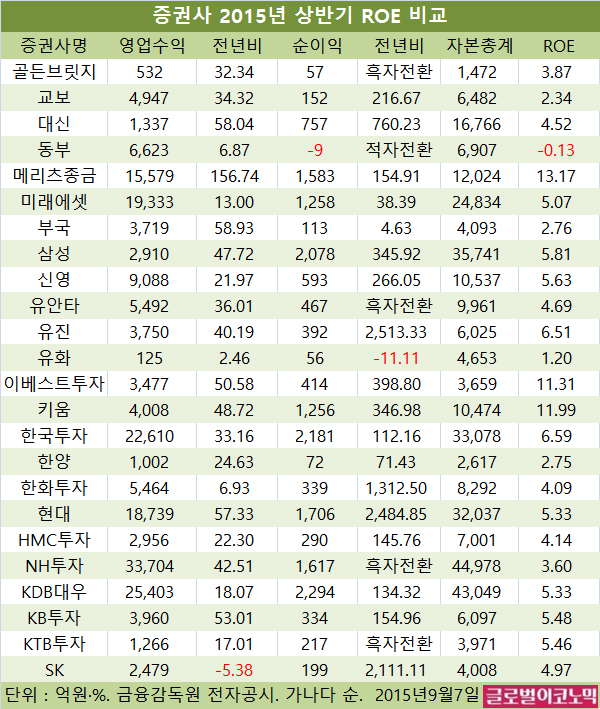 글로벌이코노믹이 조사한 24개 증권사의 평균 ROE는 5.27로 나타났다. 이들 증권사가 상반기와 같은 속도로 매출과 순이익을 기록한다면 평균 ROE는 10.54를 기록하게 된다.