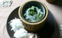 7. 이 혼합된 것을 물루키야 또는 시금치 국물 위에 얹는다. 이때 국물은 계속 끓이며 절벅 거리지 않도록 한다.