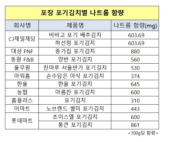 이 밖에 ▲농협 아름찬 포기김치 600mg ▲롯데마트 초이스엘 포기김치 600mg ▲CJ제일제당의 비비고 포기 배추김치 603.69mg, 하선정 포기김치 603.69mg ▲한울 포기김치 645mg 등으로 조사됐다.