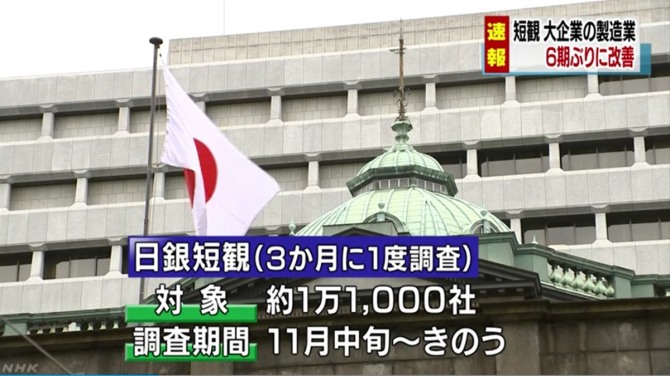 14일 일본은행(BOJ)이 발표한 4분기 단기경제관측조사(단칸) 결과에 따르면 대형 제조업 업황판단지수(DI)는 10으로 3개월 전보다 4포인트 높아진 것으로 집계됐다. 무료 6개월 만에 플러스로 돌아선 것.