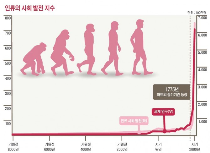 현재의 사고방식으론 엄청나게 쏟아지는 정보를 감당해 낼 수 없다. 반대로 빠른 변화 속도로 사라지는 정보는 또 어떻게 대응할 것인가? 지금의 변화는 권유가 아니다. 변화는 이젠 절대적으로 받아들여야만 한다. 그렇지 않으면 급속한 후퇴가 일어나거나 이로 인해 엄청난 손실을 입게 될 것이기 때문이다.(그림1.인구 성장과 사회 발전의 관계)