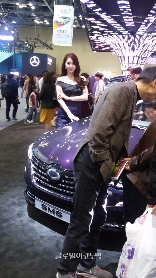 2017 서울모터쇼 개막 이틀째인 1일 르노삼성자동차 전시관에는 '아메시스트 블랙'(Amethyst Black) 컬러를 입은 SM6가 전시돼 있다. 르노삼성이 이번 모터쇼에서 처음 공개한 SM6 보디 컬러 아메시스트 블랙은 예로부터 귀족을 상징하는 보석으로 일컬어진 자수정의 짙은 보랏빛에서 영감을 얻은 색상이다.