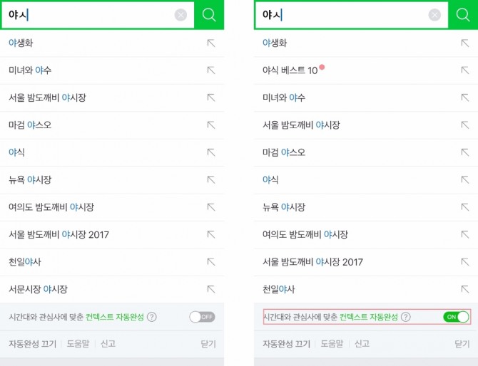 이미지 확대보기해당 기능은 매시간 로그인 기반 사용자의 검색 패턴 등 빅데이터를 분석해 특정 시간대에 따라 사용자들이 많이 검색한 키워드를 상위 노출하는 방식이다. 시간대별로 속한 그룹의 최대 관심사가 무엇인지 파악할 수 있다. 목요일 오후 11시에 “금”을 입력하면 ‘금요웹툰’이, 금요일 오후 5시에 ‘뮤’를 검색하면 ‘뮤직뱅크’가 나오는 식이다. 네이버 모바일 및 PC에서 이용가능하며 자동완성 키워드 화면 하단의 ‘온/오프(ON/OFF)’ 메뉴를 통해 설정할 수 있다.