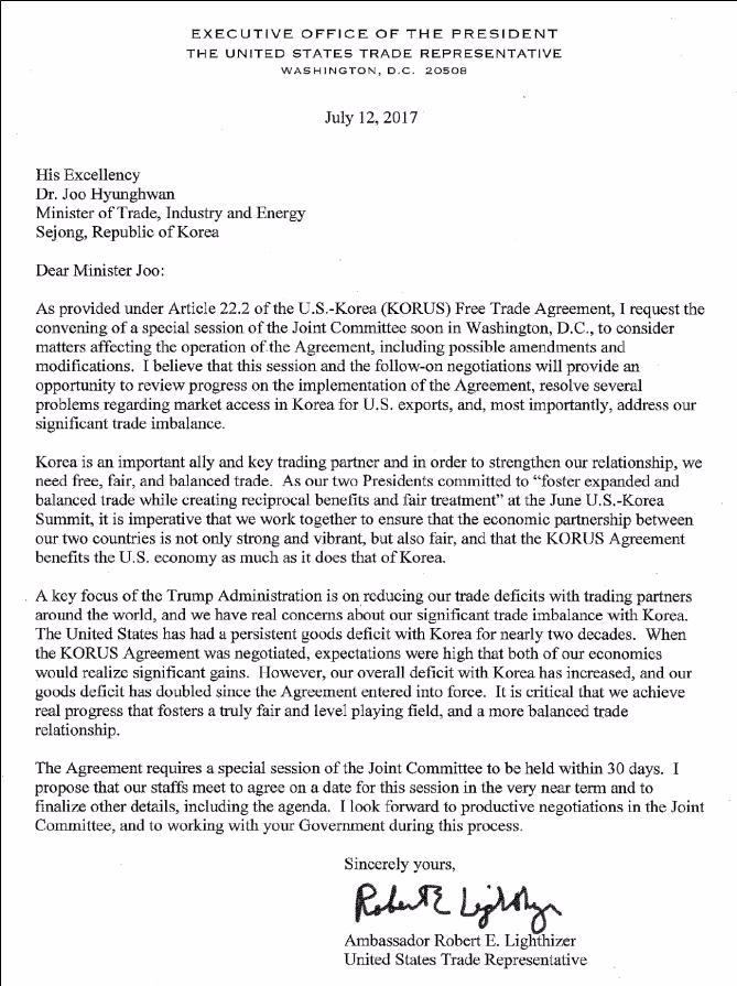 서한에는 협정문 22.2조에 따라 미국은 워싱턴DC에서 한미 특별 공동위원회를 소집해 개정 및 수정 가능성 등을 포함한 협정 운영에 영향을 주는 요소 등을 논의하자는 제안이 담겨있다.