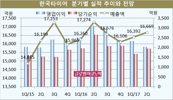 한국타이어는 올해 2분기 연결기준 매출액이 1조6669억원, 영업이익 2038억원, 당기순이익 1951억원을 기록했다고 공시했다. 매출액은 전년동기에 비해 3.5% 감소했고 영업이익과 당기순이익은 각각 34.6%, 26.4%의 급락세를 보였다.