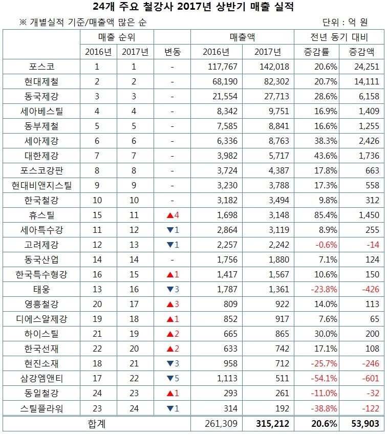 본지가 국내 증시에 상장된 24개 주요 철강사들의 상반기 매출을 종합한 결과 전체 매출(개별 실적 기준)은 31조5112억원으로 전년 동기 대비 20.6% 증가한 것으로 집계됐다.