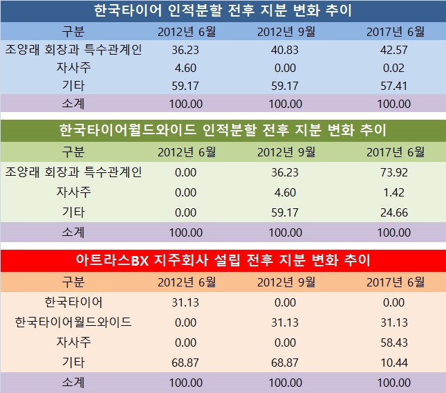 조양래 회장과 특수관계인은 2012년 9월 한국타이어의 인적분할 이후 지주회사인 한국타이어월드와이드의 지분이 5년만에 2배 이상으로 늘어났고 한국타이어 지분 또한 늘어나 ‘꿩먹고 알먹고’의 실리를 챙기게 됐다.