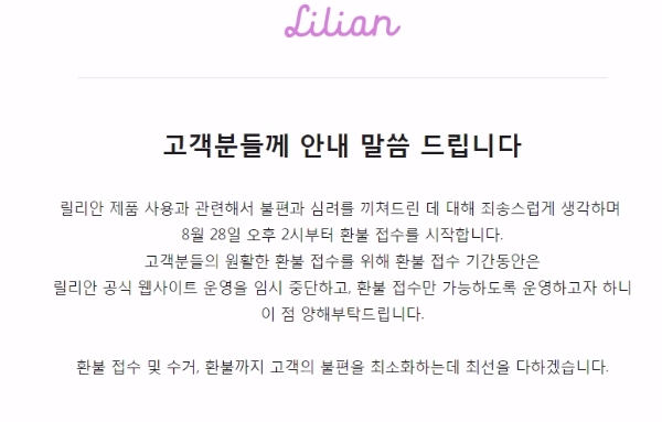 깨끗한나라는 최근 릴리안 생리대 안전성 논란이 불거지며 결국 전 제품 회수, 환불 조치를 결정했다. 하지만 환불 가격이 지나치게 낮다는 비판에 휩싸이고 있다.