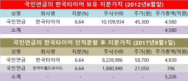 국민연금이 인적분할 후 한국타이어와 한국타이어월드와이드 지분을 그대로 유지했다면 9월 1일 현재 자산가치는 5226억원 상당으로 추정된다. 국민연금은 이 기간동안 재산가치가 14.1% 늘어난 셈이다.