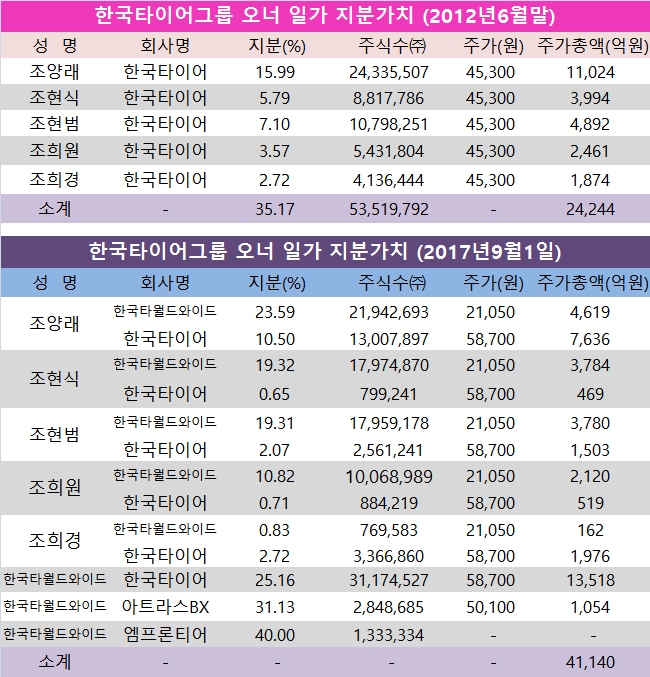 조양래 회장과 특수관계인은 한국타이어의 인적분할 이전인 2012년 6월 36.23%의 지분을 갖고 있었으나 2012년 9월 지분이 40.83%로 늘었고 올해 6월 말 현재 42.57%를 보유하고 있다. 여기에는 한국타이어월드와이드의 지분 25.16%도 포함되어 있다.