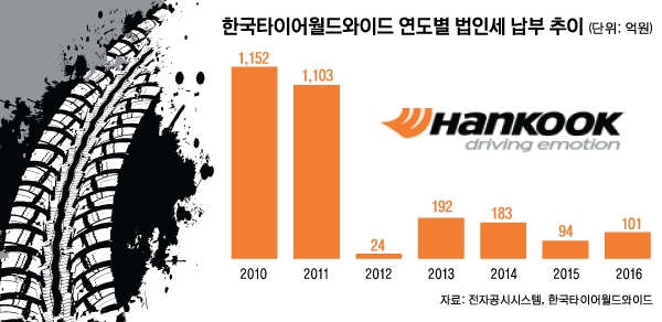 한국타이어월드와이드가 인적분할 되기 전의 2011년의 손익계산서를 보면 법인세비용차감전순이익이 3774억원, 법인세 1103억원으로 나타났다. 당시 법인세율은 29.2%에 달했다.