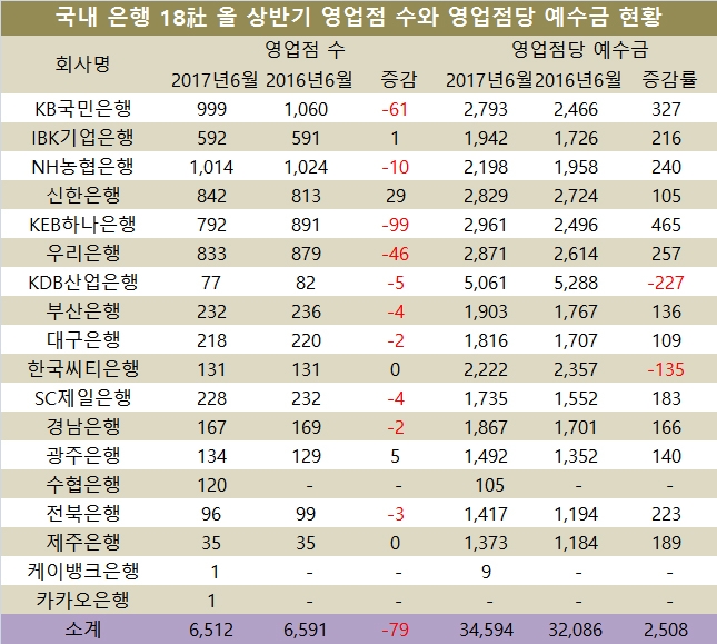 IBK기업은행은 올 상반기 영업점이 592개로 전년동기의 591개에 비해 1개 늘었고 영업점당 예수금은 1942억원으로 전년동기의 1726억원보다 216억원 증가했다.