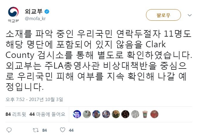 외교부는 "주 LA총영사관이 Clark County 검시소 검시관과 미 국무부 현장 파견 직원을 통해 현재까지 파악한 사망자 명단에는 한국인이 포함되지 않은 것으로 비공식 확인했다"고 보도자료와 SNS계정 등을 통해 밝혔다.