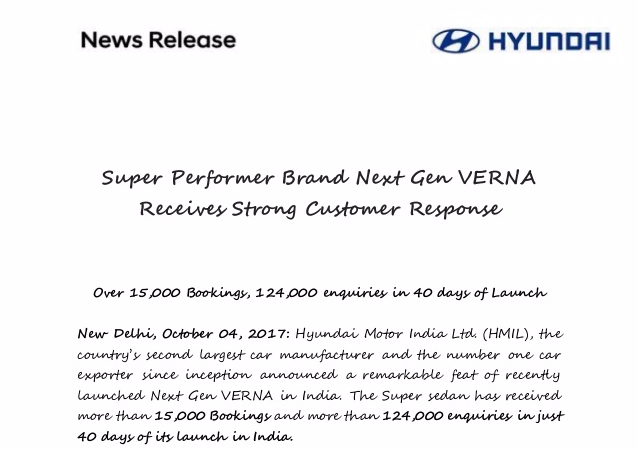 현대차 인도법인(HMIL)는 발표한 신형 베르나 예약판매 대수 등에 대한 보도자료.이미지 확대보기