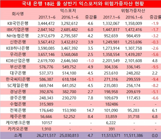 IBK기업은행은 올 상반기 익스포저가 284조7162억원으로 전년동기의 268조5482억원에 비해 6.0% 늘었고 위험가중자산은 144조7817억원으로 전년동기의 147조2416억원보다 1.7% 감소했다.