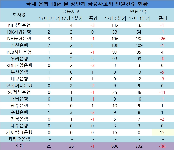 신한은행과 우리은행은 올 2분기 금융사고가 각각 7건을 기록했고 NH농협은행은 민원건수가 2분기 26건이 줄어들어 가장 많은 감소 실적을 보였다.