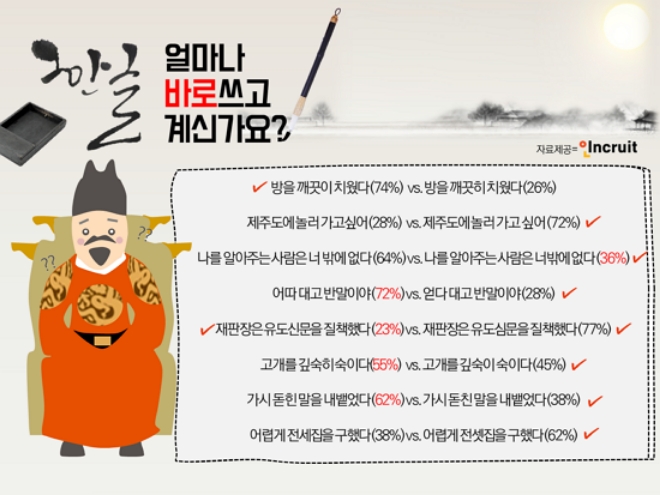 취업포털사이트가 ‘맞춤법 긴급점검’ 결과, 성인남녀의 정답률은 40%를 밑돌았다. 사진=인크루트이미지 확대보기
