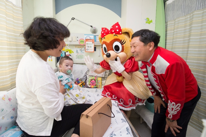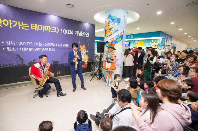 26일 오전 서울대어린이병원 로비에서는 아이들의 웃음소리가 가득했다. 박동기 롯데월드 대표를 비롯한 롯데월드 샤롯데봉사단은 서울대어린이병원을 방문해 ‘찾아가는 테마파크’ 100회 위문공연을 펼쳤다. 아이들은 잠시나마 아픔을 잊고, 손뼉을 치고 환호성을 지르는 등 행복하게 공연을 관람했다.