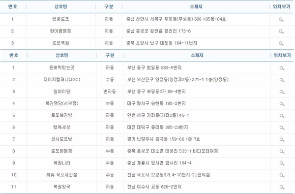 지난 779회는 부산 3곳, 대구 1곳, 전남 2곳 등 11명의 1등 당첨자 중에 인천 1곳, 경기 1곳으로 수도권은 2곳뿐이었다.