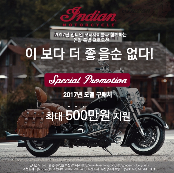 인디언 모터사이클 공식 수입원 화창상사㈜가 예비 라이더 및 프로 라이더를 위해 구매 차종에 따라 최대 500만원까지 혜택을 제공하는 2017년 연말 프로모션을 진행한다.