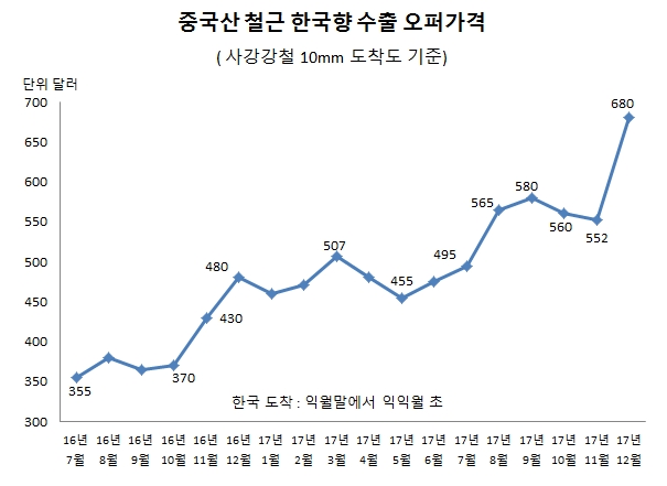 [글로벌이코노믹 윤용선 기자] 중국산 철근 수입공백이 확실해 졌다. 중국산 철근의 한국향 신규 수출 오퍼가격이 계약 불가능한 수준에서 제시 됐기 때문이다.한국향 최대 수출 메이커인 중국 사강강철은 14일, 1월말적 신규 수출 오퍼가격을 제시했다. SD400 10mm 톤당 680달러(cfr), 13mm 이상 톤당 670달러(cfr)를 제시했다. 전월 수출가격 대비 톤당 128달러 폭등한 가격을 제시했다. 이번 주 초 제시된 대만산 철근 오퍼가격 보다도 톤당 80달러 높은 수준이다.