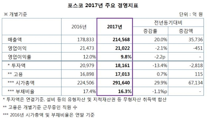 반면 같은 기간 생산과 판매는 2625만 톤, 2615만 톤을 각각 기록했다. 전년 동기 대비 2.5%(68만 톤), 2.0%(54만 톤) 감소했다. 철강 가격 상승이 매출 증가를 견인했다. 권오준 회장을부터 오인환 사장까지 이어진 WP제품 확대는 이를 극대화했다.