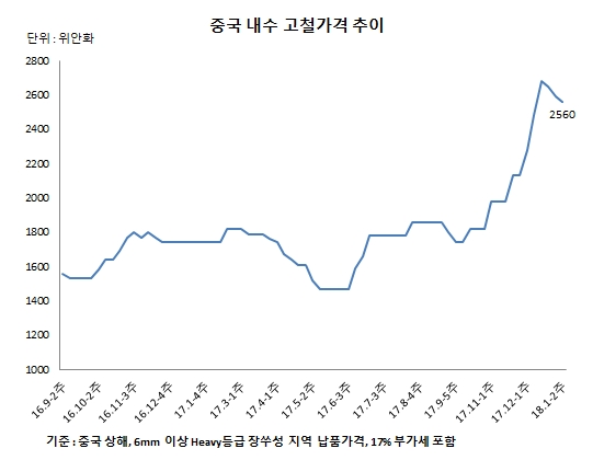 중국 내수 고철가격은 지난 12월 톤당 550위안(약 84달러)의 급등을 기록한바 있다. 내수 철강재 가격이 11월 한달 간 폭등을 기록했기 때문이다.
