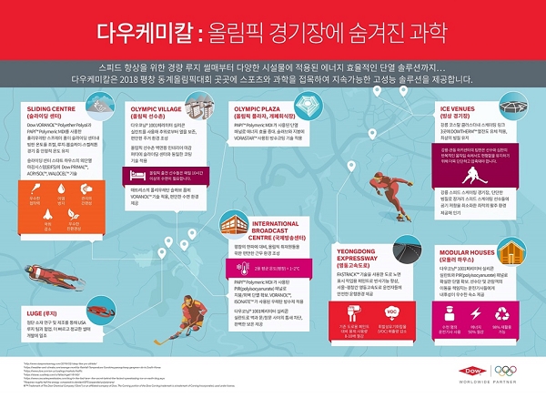 다우케미칼은 서울~평창간 영동고속도로에 사용된 노면표지용 도료와 강릉 코스탈 클러스터 내 빙상경기장 3곳에 고성능 기술을 적용했다. 미국 루지팀 썰매 제작에 참여해 다우케미칼만의 첨단 소재 및 과학 기술을 알리기도 했다.