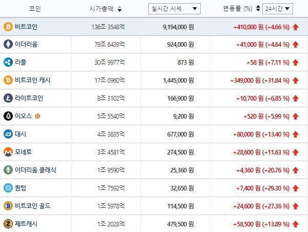 가상화폐 거래소 빗썸에서는 9일 오후 3시 40분 현재 모든 가상화폐가 전일 대비 상승한 가격에 거래되고 있다. 일부 가상화폐들은 20~30% 넘게 시세가 오르며 폭등했다.