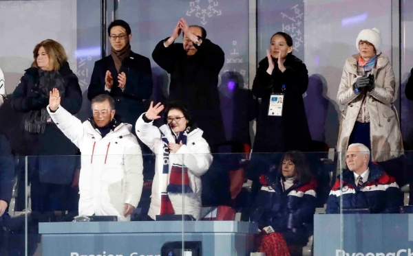 남북 선수단은 '아리랑' 선율에 맞춰 걸으며 관중들에게 손을 흔들고 답했고, 문 대통령과 김 제1부부장은 자리에서 일어나 공동 입장하는 남북 선수단을 향해 웃으며 손을 흔들었다.