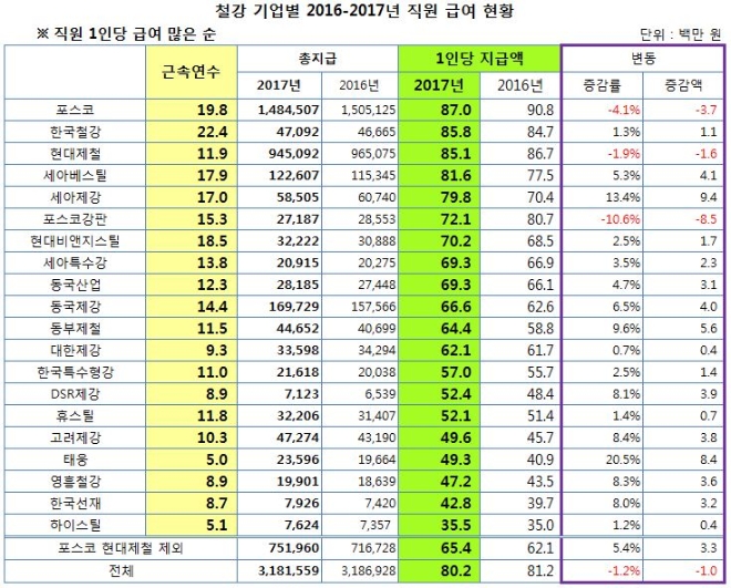 9일 철강업계 상위 20개사 직원들의 2017년 연봉을 조사한 결과 평균 8020만원으로 집계됐다.