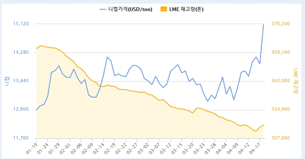 니켈 가격은 1분기에만 21% 급등했다. 지난 1월 3일 기준 니켈 가격은 t당 1만2465달러에 그쳤었다.