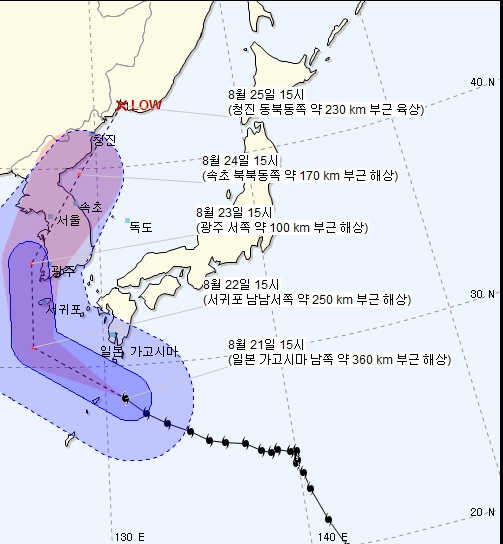 이미지 확대보기기상청은 22일 태풍영향으로 누적 강수량이 450mm 이상을 기록할 것이라며 철저히 대비할 것을 당부했다.