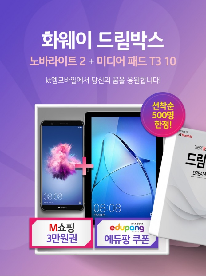 [글로벌이코노믹 표진수 기자] 화웨이는 KT 엠모바일을 통해 화웨이의 국내 첫 자급제 스마트폰인 노바 라이트 2와 화웨이 미디어패드 T3 10으로 구성된 ‘드림박스’ 패키지를 출시했다고 28일 밝혔다.