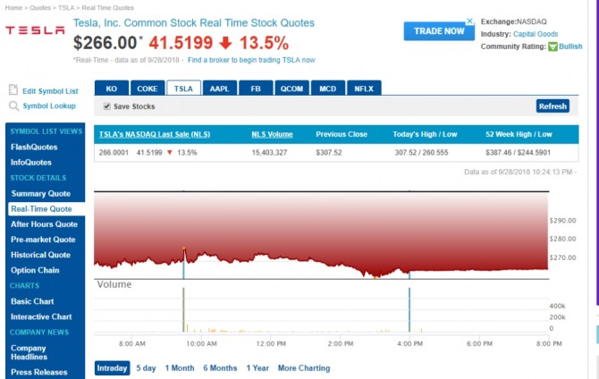 미국 뉴욕증시 테슬라 주가 변동내역 (미국 나스닥 거래소 제공)