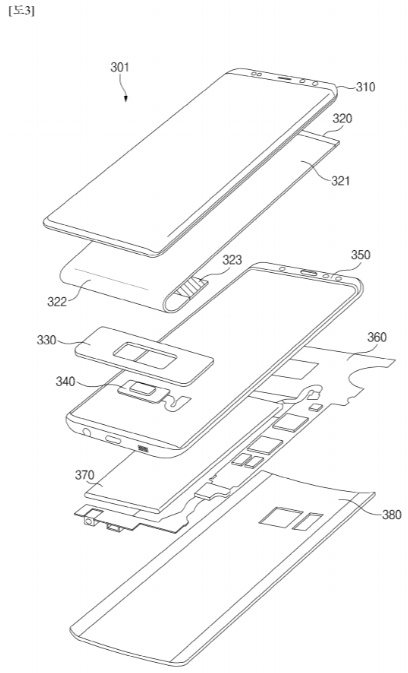 ‘생체센서를 포함하는 전자기기’라는 제목의 이 특허출원서는 분명 갤럭시S8 및 S9와 유사한 이전 도면속 단말기보다 훨씬더 앞선 기기의 모습을 보여준다. 또한 지난해 10월에 등장한 삼성전자의 이전 인스크린지문센서 특허출원내용보다 훨씬더 구체적인 내용을 보여주고 있다.