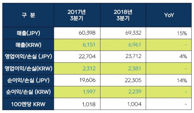 올 3분기 지난해 같은 기간보다 15% 성장한 693억엔 매출 기록