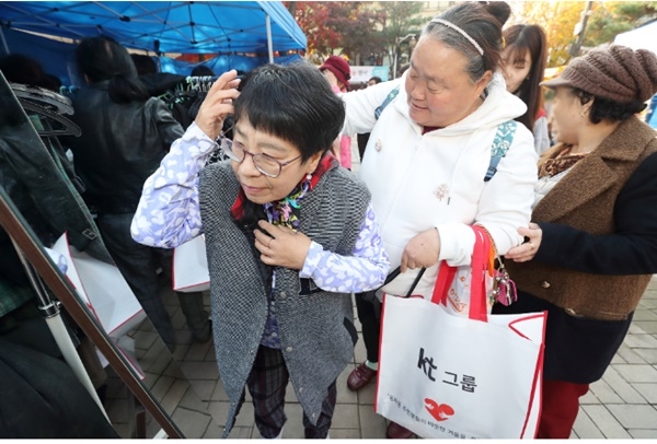 이미지 확대보기KT 방한복 나눔 행사에 참여한 주민들이 KT 임직원들과 함께 겨울 한파를 대비한 방한복을 고르고 있다. (사진=KT)