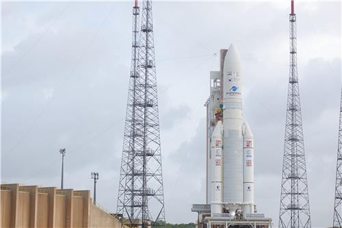천리안 2A호는 4일 오전(한국시간) 남미 프랑스령 기아나의 기아나우주센터에서 아리안스페이스사의 '아리안-5 ECA' 발사체 상단에 실린 채 발사를 기다리고 있다.