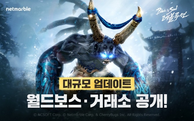 넷마블(대표 권영식)은 모바일 MMORPG(다중접속역할수행게임) '블레이드 & 소울 레볼루션(개발사 체리벅스)'에 월드보스, 거래소 시스템 등을 추가하는 대규모 업데이트를 실시했다고 20일 밝혔다.