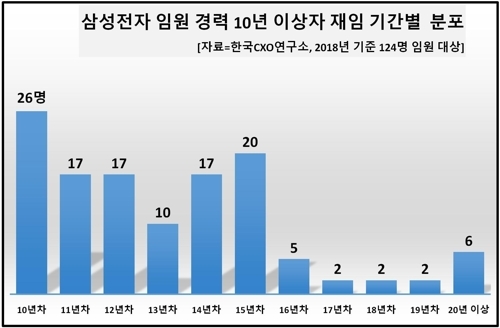 그 임원 가운데 10년 넘게 자리를 지킨 사람은 124명이며 올해 재임 10년 차를 맞은 임원이 26명이었다.